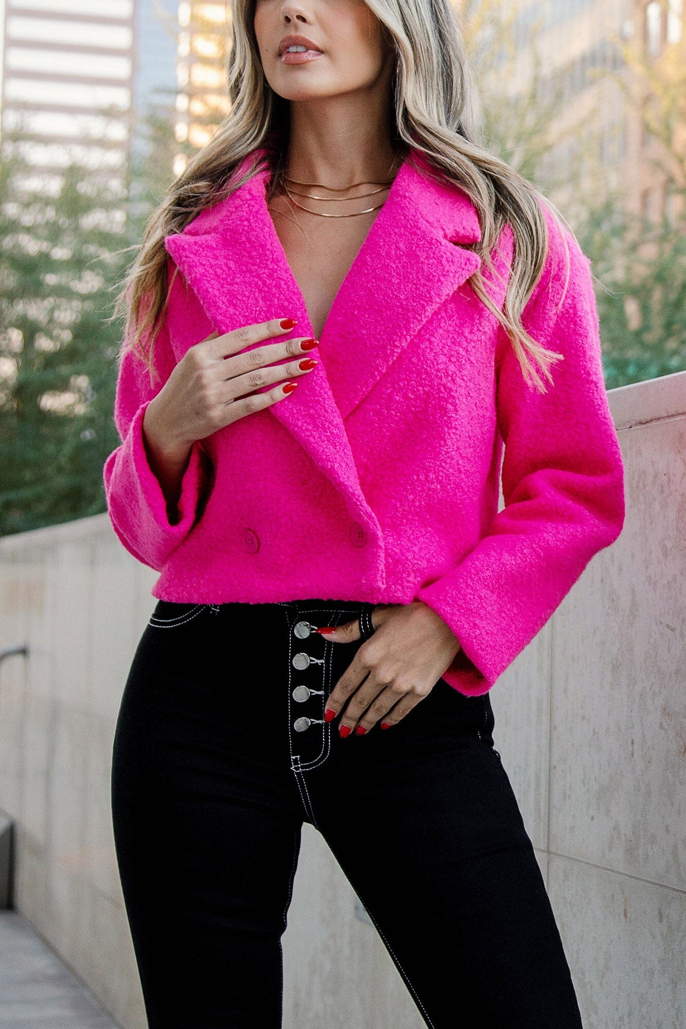 Calling all trendsetters! Meet the Madonna Fuchsia Crop Jacket! Featuring a cropped fit, soft teddy material, a collard neckline with a notched lapel, one front button closure, and two pink front buttons. Style this jacket with our Keagan Black Jeans to complete the look! Lined.